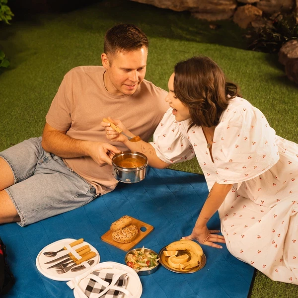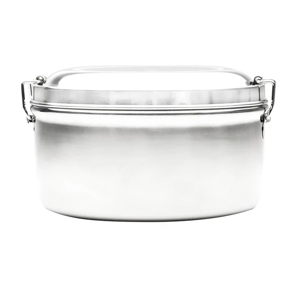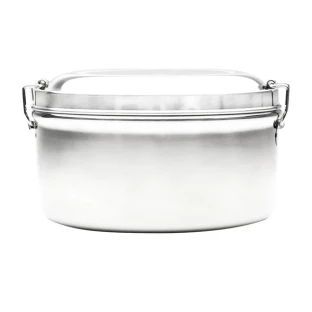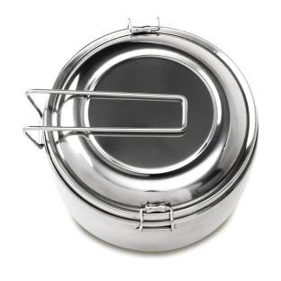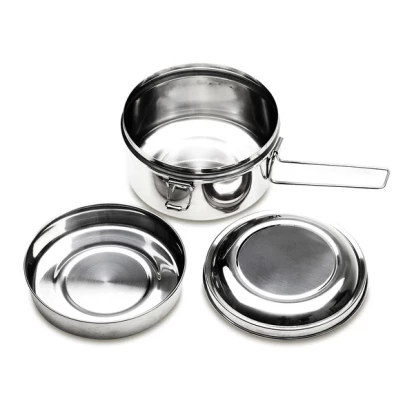 3-elementowy zestaw turystyczny ze stali nierdzewnej. W jego skład wchodzą: naczynie/garnek o pojemności 1l, mniejsze naczynie o pojemności 350 ml i pokrywka. Całość zamykana na klamry boczne.